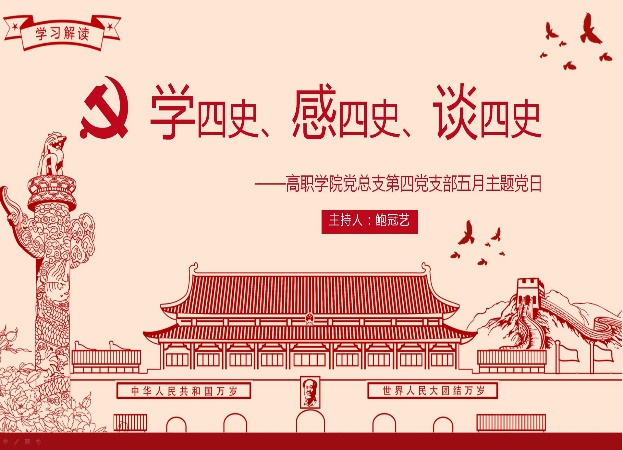 公司党总支第四党支部首先共同学习了习近平总书记重要讲话中有关“四史”的重要论述,领悟了“四史”教育的指导思想、任务目标、学习内容,然后发挥支部成员善于思考钻研,乐于学习分享的特点,着重探讨交流学习心得。党支部书记鲍冠艺介绍了“四史”学习教育的背景,强调了理论学习的重要性,勉励党员同志要把“四史”学习教育与学习习近平新时代中国特色社会主义思想紧密结合起来,以史鉴今,自觉加强理论学习,提高政治觉悟,增强政治能力;在疫情防控常态化和加快恢复生产生活秩序的国内形势中努力学习、观察和实践,发挥自己的作用。辅导员昂宇表示,作为一名高校员工思想政治辅导员,除了通过学习“四史”来增强自身理想信念和提升党性修养,更要思考如何将“四史”讲好给员工。要引导员工知史爱党、知史爱国,让“红色基因”通过生动、鲜活的历史故事得到发扬传承,忆苦思甜、居安思危,让同学们从红色历史中吸取精华和强大精神动力。员工党员刘洋志用摘录金一南在《苦难辉煌》话来总结他关于学习四史心得:首先,要把个人理想和追求融入到国家和民族事业中;其次,要提高自身能力,扎实练就本领,实现人生理想;最后,要以“为中国人民谋幸福,为中华民族谋复兴”的初心使命严格要求自己,把理论学习应用到实践中去。