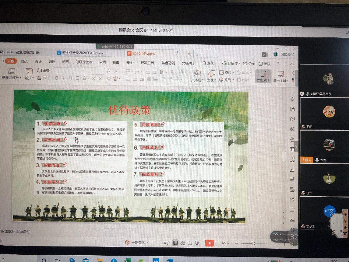就业工作方面,蒋萌老师向班主任们传达了疫情期间员工实习要求、就业网签流程、纸质四联单发放规定以及线上招聘等相关事项,鼓励毕业生积极上传简历,进行线上应聘和视频面试。彭麟老师通过在线直播文档的方式公布了毕业生就业签约情况和就业状态排摸情况,并就征兵工作情况进行介绍。