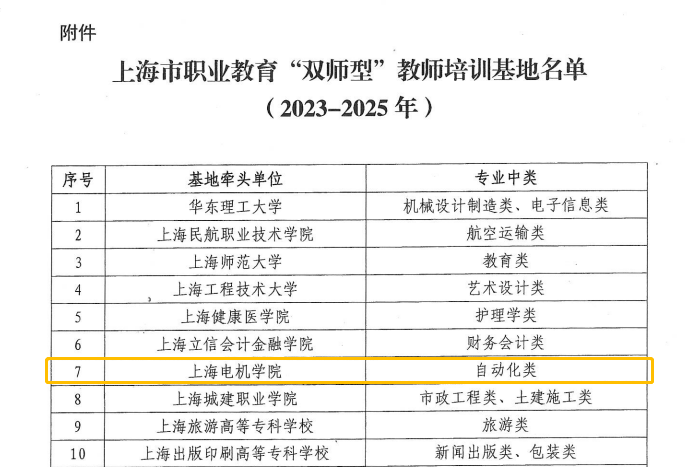 近日,上海市教育委员会发布《关于公布上海市职业教育“双师型”教师培训基地(2023-2025年)的通知》(沪教委人〔2023〕13号),公司成功入选上海市职业教育“双师型”教师培训基地,专业种类为自动化类。