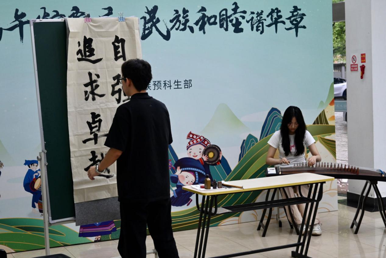 活动伊始,舞龙队开场别开生面,紧接着一曲悠扬的钢琴曲正式拉开活动序幕。随后,在古筝悠扬婉转的配乐中,同学们用苍劲有力的笔法写下了校训“自强不息,追求卓越”。民族歌舞串烧点燃了全场气氛,大家载歌载舞,尽情展示着民族员工的青春风采。