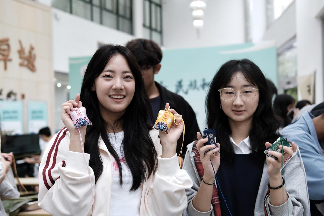 包粽子环节把活动推向了高潮,在老师耐心的指导下,铺粽叶、填糯米、放粽馅、扎线绳。只见粽叶轻盈舞动,麻绳来回穿梭。一个个棱角分明的粽子、一根根细绳包裹着传承千年的味道,在同学们手中诞生了。大家的粽子形状各异也各有特色,在自己动手的乐趣间,呈现出一派欢乐祥和。最后,师生还亲手制作香囊,沉浸式体验传统手工艺品的制作过程,感受传统工艺的魅力。