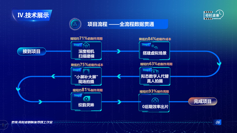 项目致力于虚拟制片传媒新形式,打通一条“自由”、“无界”、“无限想象”的全流程数据贯通模式,追求虚拟制片为影视产业工业化带来的价值。通过结合AI智能视频生成模型技术,运用小屏补大屏、三维扫描建模等核心技术优势,在其基础上还有“拟态数字人”、“虚拟场景”等衍生技术资源优势,打通从接到项目到完成项目省钱高效的定制化制作模式。过程中,虚拟场景数据、摄像机运动数据等各项数据全流程贯通,将省钱高效贯通全部流程,缩短近78%的制作周期和81.2%的制作成本,让有拍摄或商业广告需求的用户在减少成本的同时大大压缩项目周期,在全流程中选择符合自己需求的项目服务,尝试新技术新模式。在新的一年中,团队融合AI新技术带来新技术“纹韵灵眸”,进一步优化全流程制作效率。