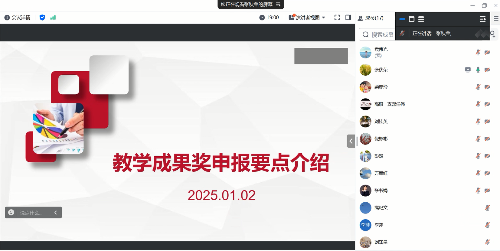 张秋荣教授就教学成果奖的内涵、申报范围、申报书填报注意事项、国家级教学成果奖典型案例分享等方面进行了详细的讲解。他指出,申报教学成果奖需要教师们在教学实践中不断积累经验,注重教学创新点的凝练和成果的示范推广。同时,申报材料的撰写要突出教学问题导向,做到条理清晰、逻辑严谨、数据。在互动环节,教师们积极提问,就中高贯通人才培养的特色凝练、产教融合的途径、成果推广的方法等进行了深入的交流和讨论。