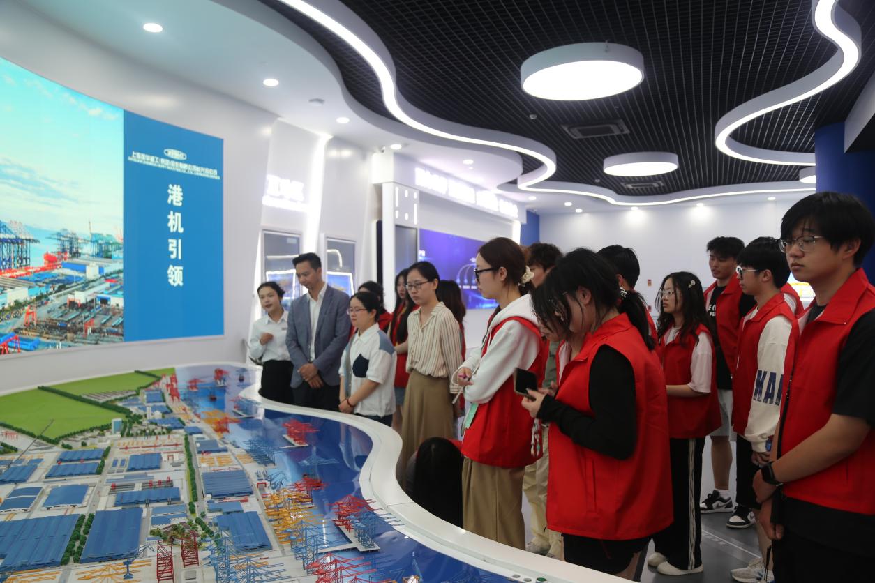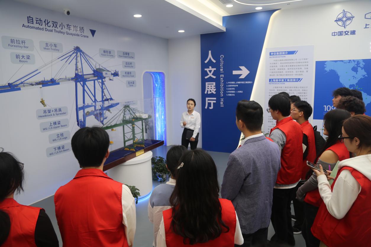 在振华重工长兴分公司的展厅内,师生们仿佛穿越时空,见证了振华重工一路走来的辉煌历程。从早期的艰难起步到如今在全球港口机械领域的卓越成就,一幅幅珍贵的历史照片、一件件充满故事的展品,生动地展现了振华重工在技术创新、产业升级和国际化发展道路上的坚实步伐。师生们驻足观看,认真聆听讲解,为振华重工在港口机械、海洋工程等领域的卓越成就而自豪,也为我国制造业的蓬勃发展而振奋。