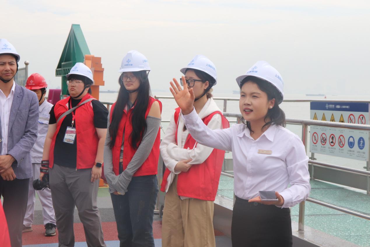 随后,师生在讲解员的带领下来到了长兴基地码头,开展了一场身临其境的现场教学。巨大的岸桥设备整齐排列,犹如钢铁巨人般矗立在码头边,这些岸桥是港口装卸作业的核心设备,其起重量、起升高度和外伸距等关键性能指标均处于世界领先水平。它们广泛应用于世界各大港口,成为中国高端装备制造的一张亮丽名片。